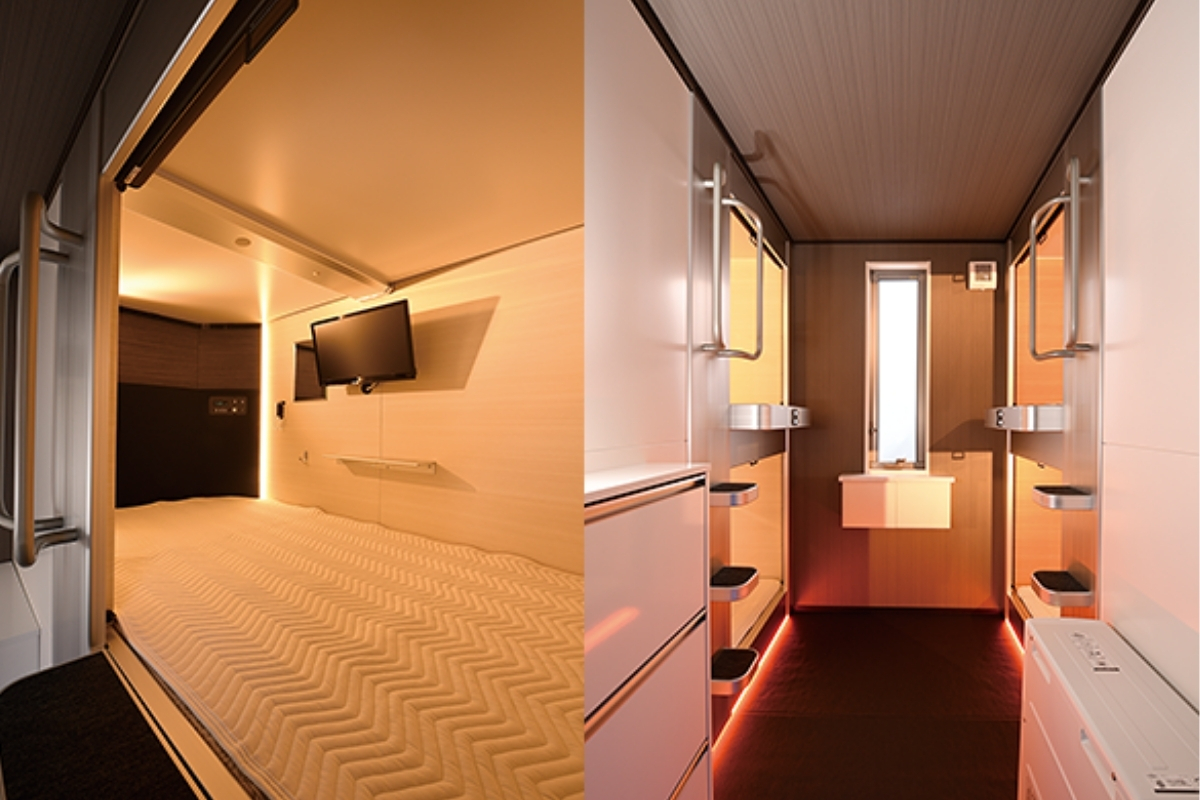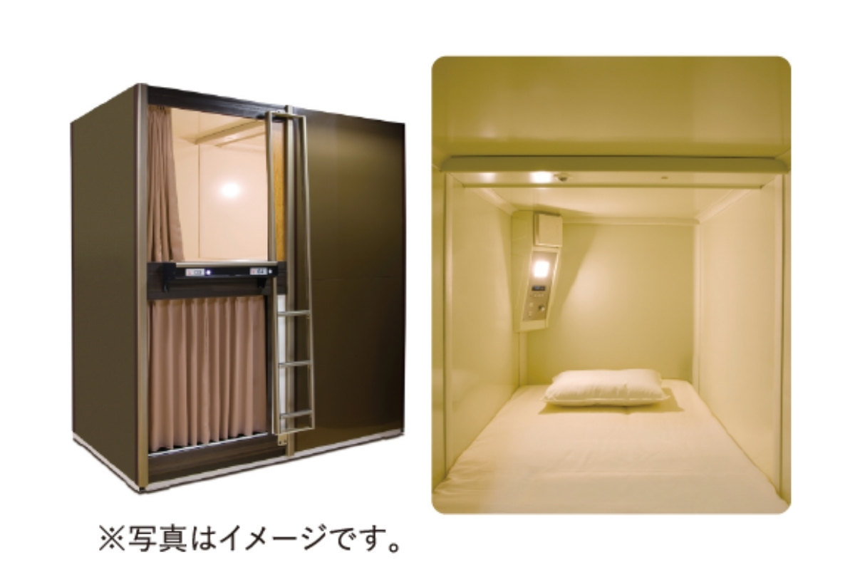 カプセル設備 寝具、テレビ、鏡、ロールスクリーン(遮光・防炎)、手元灯、テーブル、カップホルダー、ハンガー掛け、ナイトパネル(デジタル時計付)、 小物入れ(100V コンセント、USBジャック)、換気ファン
