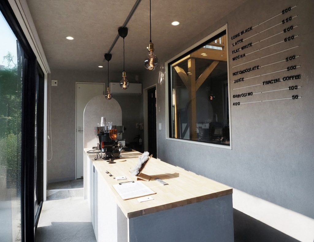 住宅敷地内に設置したモルタル調の内装と木目カウンターが映える、スタイリッシュなコンテナカフェ。コンパクトで実用的な店舗モデルで念願の店舗をオープン。